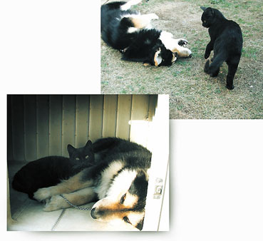 と芝犬ぽい容姿)の小屋には黒い子猫が同居している。