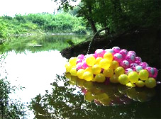 (上から) 木々の間にネット、池に風船、竹と石、赤い大蛇風な布。