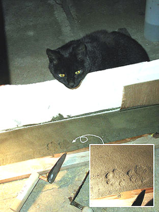 ていねいにコテで仕上げたセメントの真ん中に猫の足跡!