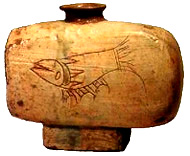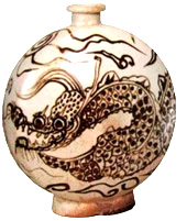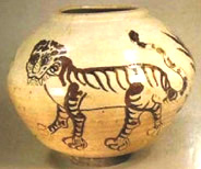 ●連載=クボユーシローの ふぉとふぉと 連載・『李朝』のデザイン その3 李朝の陶磁器作家たちはオチャメ。 我々の朝鮮族に対するイメージは頑固、感情が激しい、バイタリティー…。 『ユーモア』は浮かばない。しかし、李朝の陶磁器にはユーモラスな絵が たくさんある。朝鮮族って本当はヒョウキン族かも。 白磁鉄画雲龍文扁瓶 龍が笑っている。 白磁鉄画虎鹿文壺 この裏にいる鹿を追っている。 鹿もこの虎じゃ怖くなかろう。 粉青沙器彫花魚文酒瓶 漫画みたいな魚、おまけに逆さま。 戻る