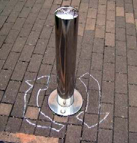 ステンレスの棒状車止めの下に白墨で子供が遊びで描いたのであろう矢印。
