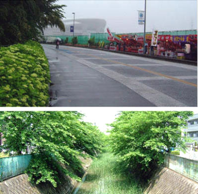 近所の普段ドブ川の伝右川、この時期は桜並木の緑が生い茂り川を覆う。城