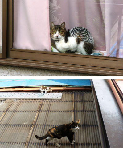 北隣のお宅の屋根の上、この辺が縄張りの雌ネコと赤ちゃんネコ一匹。時々「ミャーミャー」