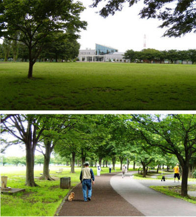 芝生の広場を囲むように約2kmの歩くコースと走るコースが並列してあり、その外側