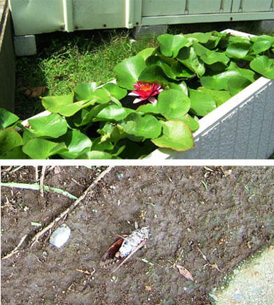 散歩途中、睡蓮の花に突然出くわした。道路に面した狭い三角スペースのコンクリ製の