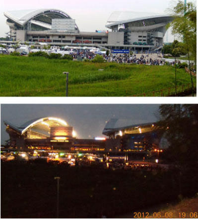 夜になるとブルーのライトでスタジアム全体をライトアップすると聞いて楽しみにしてい
