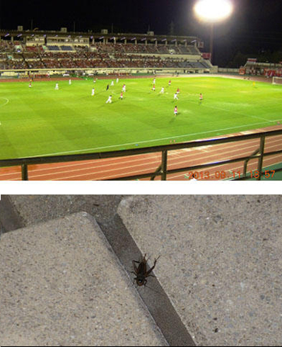 2階席の前の方で観戦していたら、そばの通路に黒っぽい虫が飛んできた。ゴキブリかな